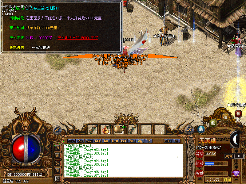 公告:首次抢沙奖励为自动发放,无人工干预,请第一界城主在抢沙当日晚10点后自己到沙皇宫内找(沙城奖励)领取,奖品为:元宝40万!