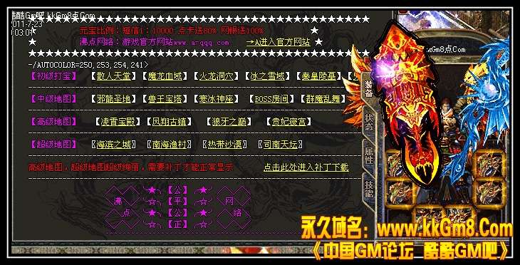 【更新】新增【雄鹰浮云】超漂亮的顶级套,超高的属性!请到下载好补丁, 华丽的外观谁看了都会心动!全套出发HP+2500,MP+2500.攻魔道+100.已激发,传送命令@move,超帅超刺激