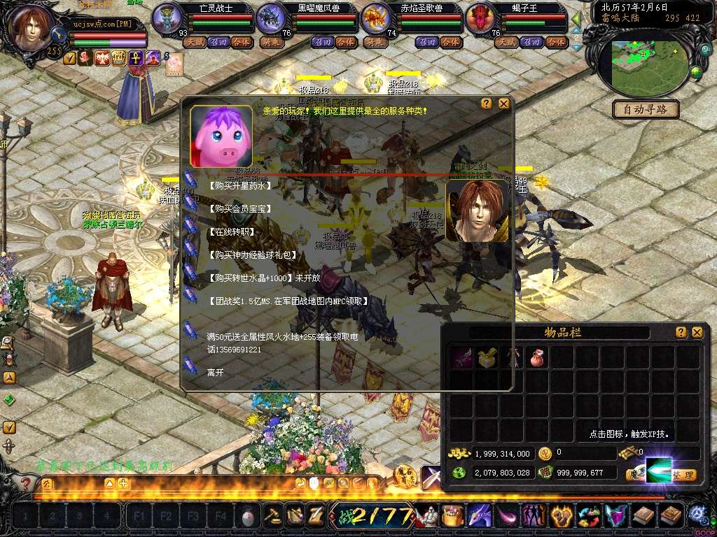 【新手配置】:上线10亿MS +255装备 送255级 VIP6 每怪自动进包500MS 超级刺激!