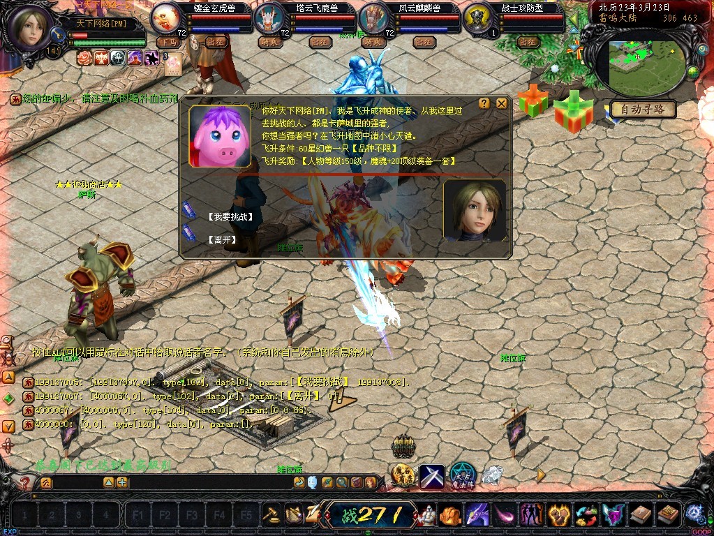 4: 加入飞升成神任务,只要你身上有1只60星的宝宝一只,即可进入飞升成神挑战,奖励等级150级,加20终极装备一套!