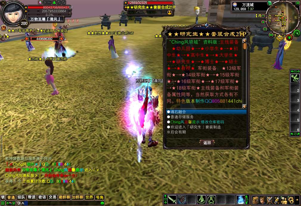 更新说明:1.更新军衔系统13级军衔 450W声望!「14级军衔」500W声望.「15级军衔」 600W声望.「16级军衔」 700W声望.「17级军衔」 900W声望.「18级军衔」 1200w声望2.更新限量版书页合成<让所有玩家都可以拿上限量版的武器,不需要再和会员挣抢野外BOSS了>:请到24品合成那合成:具体材料请大家进游戏查询!!3.修复通用战宠合成的BUG,改成材料合成,请到特殊道具合成那合成:具体材料请大家进游戏查询!!8月10日上午10点已更新:24品武器打孔功能,您不会再嫌弃自己的武器攻击低了,如果是一洞,那您还等什么呢,赶紧去司令合成那打洞吧,几率为50% <人品+运气=孔的数量> 最高2孔~~更新后24品武器均不可以交易,装备首饰可以交易~~友情提示:游戏中的终极法魂石和会员的终极法魂石的属性是一样的,游戏中显示不正确!请大家互相转告~【版本介绍】: 请大家爱护游戏环境,大家公平竞争,拒绝秒挂.点击查看秒挂标准※双倍爆率地图,300级玩家可以进入或者每天晚上8-9点可以进入。※新手每天报到奖励,只要您每天上线了就可以领取奖励.只要连续上线八天,将可以合成全服最好属性的披风:「限量珍藏版」披风。※添加限量版披风,武器,戒指,攻击和属性都是最上乘的。【武器有攻击等级属性】※在线泡点功能,2小时奖励5个幸运金蛋<可以开出所有材料+会员装备>※挖宝活动,飞来镇每30分钟刷新一次,每次4个宝箱,【能挖出会员装备哦】※本服22-24品可以机枪枪。22-24品可以大瞬<22品以下均不可以瞬发> 【注意:法师必须是套装】※八折VIP卡,持有此卡购买会员8折优惠。各大BOSS都有几率爆出!!※新增「变种」大力神 和 「变种」飞天猪 所有玩家出门必带宠物哦!※超炫武器外观,全新多种玩法,多样武器外观变化,集美观新颖,交友温馨,打架激情于一体。※所有装备精练后都会大大增加属性基本在2-3倍左右哦!!※添加官方最新时装,飞机,坐骑。让您眼花缭乱!!※所有特色稀有观宠/飞宠/坐骑/时装商店低价购买,包裹跟宠物笼全部扩充好,地图全开!※本服取消乾坤袋,购买物品请到万流 商人NPC购买※结婚系统保存几率为50% 请玩家结婚后尽量半小时内不要下线※本服承诺,绝对公平稳定长久,家族进服一律不给任何待遇,所有物品在游戏中均可获得,普通玩家只要多花点时间与耐心,与会员一样厉害。【上线设置】:本服上线万流安全区 上线150级, 修真大乘【双修一秒】 17品套装一套 仙魔技能书各一套<仙技能书在仓库>。声望450W→【可以去军衔领取使者那领取13军任务 然后去远征营地杀掉5个美人鱼最后获得13军套】. 注意:上线赠送的4个二级攻击石头,是给您准备打在19品武器上面的,切记请别卖到商店了,不然后面说打着BOSS累,请别怪客服!!希望大家相互转告!! 包袱赠送一个新手指导,如果您不知道材料的出处和BOSS的坐标,您可以一览新手指导,方便所有玩家不用看网站就知道在哪刷材料了。【装备顺序】:装备依次顺序为:新手送的【班长】——19品【排长】 —20品【连长】— 加强20品【营长.团长】 — 21品【旅长】 —22品【师长】 — 23品【军长】 — 24品【司令】。军衔依次顺序为:新手送的【13军★40W声望】——20品【14军★500W】 —21品【15军★600W】— 22品【16军★700W】 — 23品【17军★1000W】 —24品【18军★1400w】以上的装备请所有玩家游戏体验。注意:【装备品数相等的装备属性也相等】【副本介绍和材料出处】:材料图片教您该去哪49副本爆出: 爆出: 【排长】成品套装59副本或渔村 爆出 【★军人之魂★】 【★军人之魄★】 【★军人之灵★】 合成:20品【连长】59副本和飞来镇 爆出 【★★军官证★★★】 此材料为通用材料.可以合成任意材料 合成 :【营长.团长】89魔副本 爆出 〓完〓 〓美〓 〓世〓 〓界〓 合成:21品【旅长】89魔副本 爆出 〓完〓 〓美〓 〓世〓 〓界〓 合成 :22品【师长】89仙副本 爆出 〓金〓星珠 〓木〓星珠 〓水〓星珠 〓火〓星珠 〓土〓星珠 合成:23品【军长】89仙副本 爆出 〓金〓星珠 〓木〓星珠 〓水〓星珠 〓火〓星珠 〓土〓星珠 合成:24品【司令】神月副本和飞来 爆出 〓等级卡〓夜郎和夜哭小怪 爆出 〓声望牌〓 分为:200-10000不等的声望牌 【为了玩家考虑声望牌多了点的累,积累100个声望牌可以去WL声望牌换取员直接换取声望】【野外BOSS介绍】:〓凤姐〓会员武器 坐标 夜郎 123.319 103.321 【每3小时刷新一次 每次2个 每个必爆一样】〓凤姐〓会员首饰 坐标:通天糊 414.588 431.588 【每3小时刷新一次 每次2个 每个必爆一样】〓凤姐〓会员披风头盔 坐标:太极滩 583.984 575.993 【每3小时刷新一次 每次2个 每个必爆一样】「轮回·天尊」神器 坐标:万流城北郊 101.865 99.875 【每4小时刷新一次 每次2个 每个必爆一样】「轮回·魔尊」限量 坐标:夜郎 116.324 【每2小时刷新一次 每次1个 每个必爆2样.注意此BOSS爆的是材料.合成终极武器和戒指的必备材料】 友情提示:游戏中除了军衔装备24品武器和限量武器外其它套装均可交易!【任务系统】:每天报到奖励:只要每天上线报到后系统就会赠送您:二张无敌符和 俦具:「限量披风」加强版 两个 【集齐15个将可以合成限量版披风,全服属性最好的】金蛋声望任务:完成任务后系统会赠送您2000声望和幸运金蛋一个【幸运金蛋能开出所有材料和会员装备】在线泡点奖励:每2小时系统会赠送您5个幸运金蛋 【幸运金蛋能开出