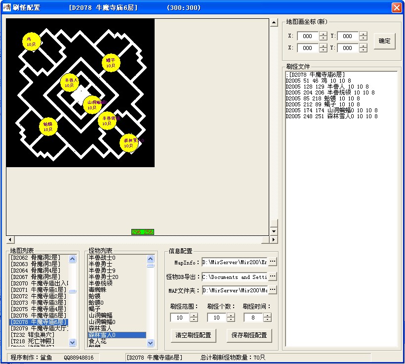 首先我们先将怪物DB用DBC导出到文本(打开DBC选择Monster.DB数据库---在表框里面单击右键---导出记录到ASCII文件---点击红色小箭头选择导出路径---单击导出---选择“是”---OK搞定),选择版本里面的mapinfo.txt文本-----然后选择已经导出的怪物数据文本-----最后选择版本里面的map地图文件夹,之后我们就可以选择地图和怪物进行刷怪配置了,工具简单实用,高效,免费,安全,希望大家多多支持GM