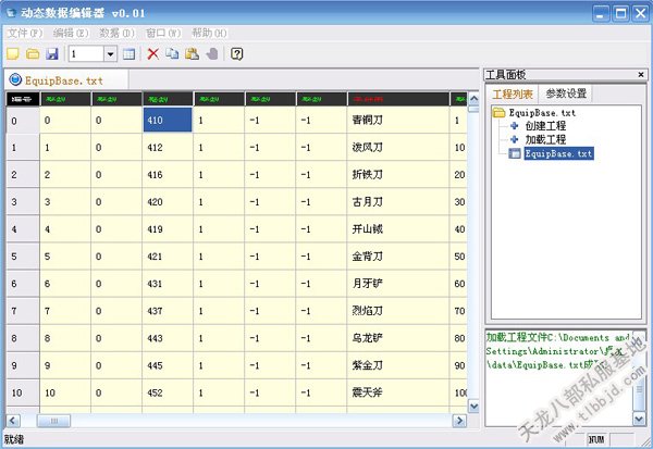 打开DataBaseEditor(动态数据编辑器),打开刚刚导出的文件EquipBase.txt.文件里的物品列表一目了然,第1个就是我们要修改的"青铜刀",双击要修改的数据即可进入编辑模式,修改完毕保存.