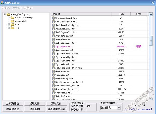 和导出资源一样,打开资源包data_Config.axp,点击添加文件,选择修改好的EquipBase.txt文件,看见资源包里的EquipBase.txt文件后面有替换字样就说明文件替换成功,教程完毕.