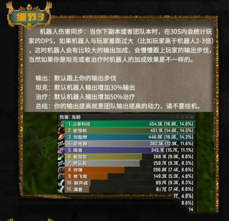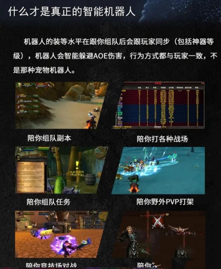 机器人在陪你打副本的时候,可以打断施法、可以智能的躲掉BOSS释放的AOE伤害技能,让你跟机器人进行副本时有更多的乐趣。