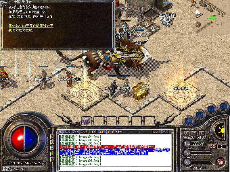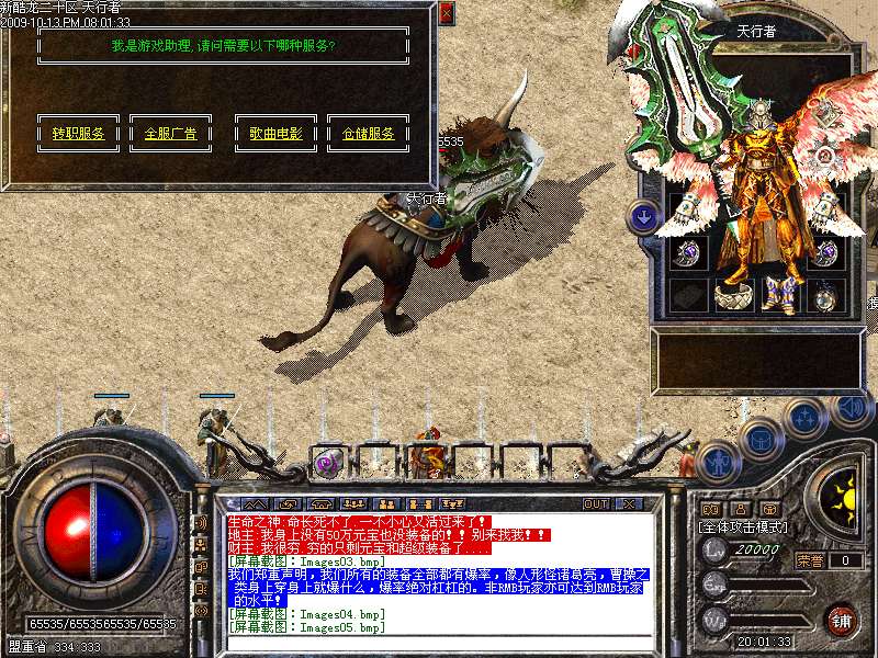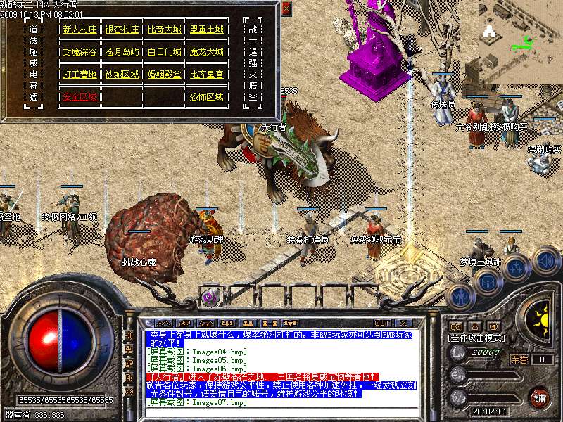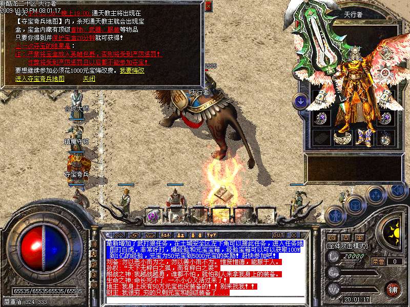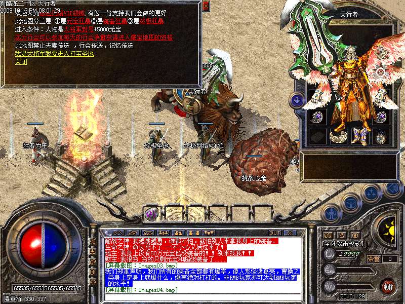 新增加激情地图,黄金屋,只要进入此地图,每分钟自动增加60元宝,每秒增加200000经验,而且还有BOSS貂蝉,而且这里PK杀人不增加PK值,不红名,行会必争之地!