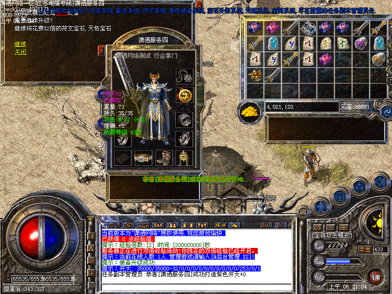 [潇洒网络]独创行内首家紫色装备升级系统.所有装备都可以通过升级成为紫色装备.装备名字是真正的紫色.最高升级+2.所附加的属性绝对让装备实力提升一大截.只要武器属性加的对,开天也能比顶级武器强悍.属性加成是随机性<测试版本不开放>