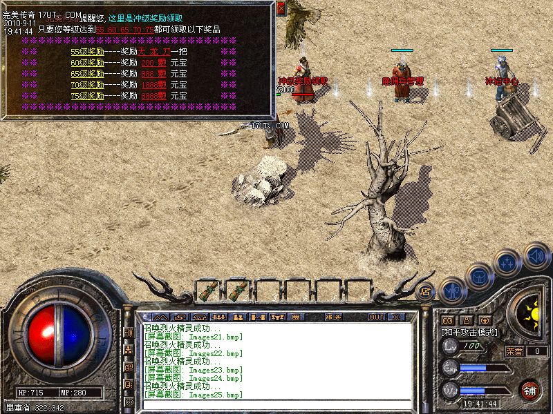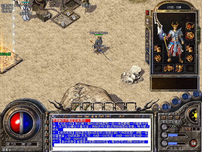 游戏奖励:将玩家升到65级后可以到我们的“冲级奖励”领取一套狂雷装备,55级奖励---天龙刀..60级--200元宝..65级--888元宝70级--1888元宝.75级--8888元宝!