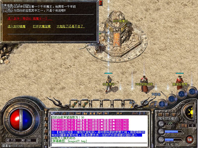 二.【地图介绍】:更新镇魔神石,进入条件必须达到70级拥有我们的镇魔令方可进入.里面隐藏了一只千年法魔爆率是全天下最高的...