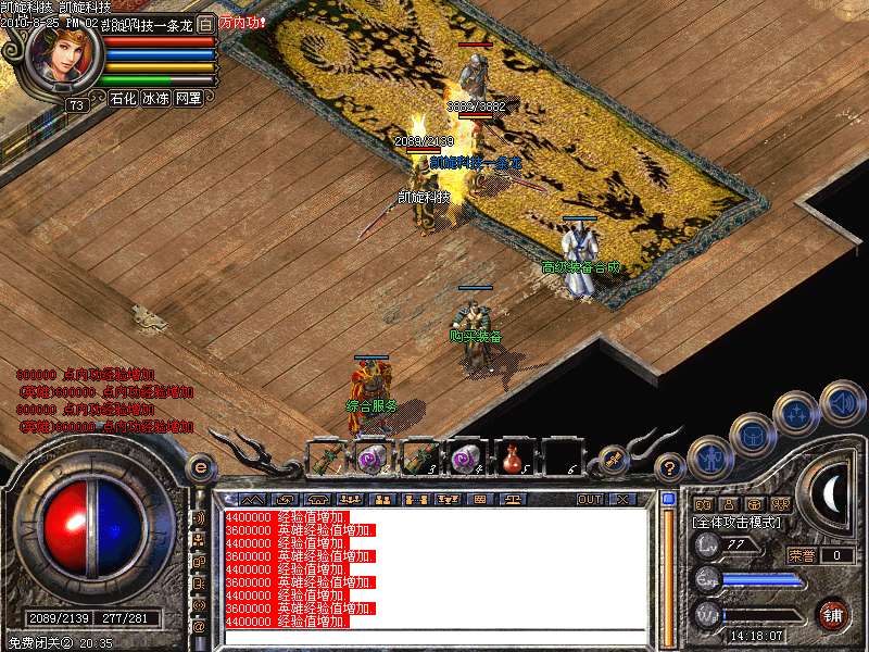激情殿堂: 打初中级装备,另外进入本地图可和免费闭关一样自动获得100万经验和内功经验!
