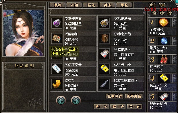 金钻特权:快速传送高级地图,每日领奖,优惠发广告,移动仓库,免费洗红等.更多请加入金钻贵族,努力赚元宝吧!