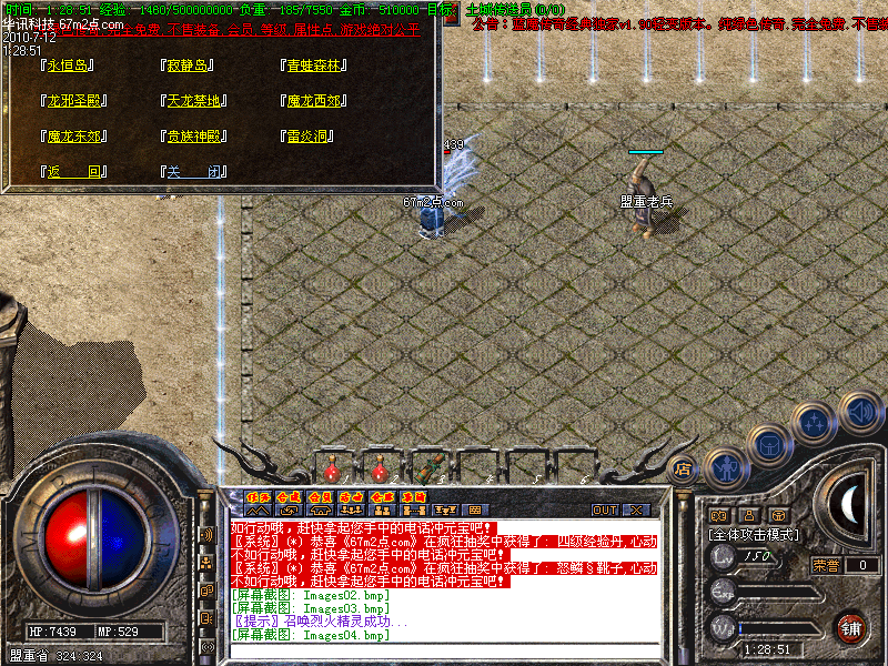 ★修正练级问题,练级变的非常容易,新手去蜈蚣打怪升级,基本是满屏的怪物 ★增加宝箱系统,可以开出本F所有装备 ★为普通玩家考虑,新增专暴元宝地图,只要你用心打,一天赚5000个元宝是没问题的 ★增加灵魂属性系统,有元宝的玩家可以去试下,效果是非常不错的~ ★增加坐骑系统,坐骑需要在天机老人那里合成,带防麻痹属性,帅就一个字 ★ 烟花之地,玩家可通过打怪获得九珠连环炮,或在商铺购买,燃放后有机会进入此地图,暴率是外面的3倍,暴本服终级装备 ★ 天邪圣地,共4层,装备暴率是外面的2倍,暴本服终级装备 ★ 幽灵禁地,装备暴率是外面的2倍,暴本服终级装备 ★ 飘渺神殿,此地图刷本服所有BOSS,暴本F所有装备,包括金牛装备 ★ 最新增加装备回收,大家可以把多余的装备换成50万~100万~200万~500万~等不同的经验~不用元宝练级也快 1 新增加稀有物品,稀有物品可以打造至+9,85级装备!打造成+9只需10件普通稀有装备!