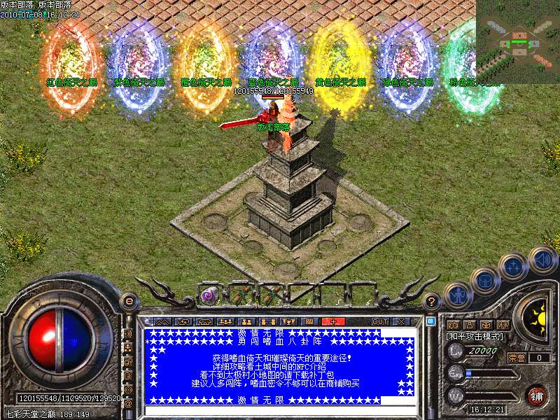 增加最新地图:七彩天堂之巅。此地图分7个地方。分别可以爆出七彩装备!