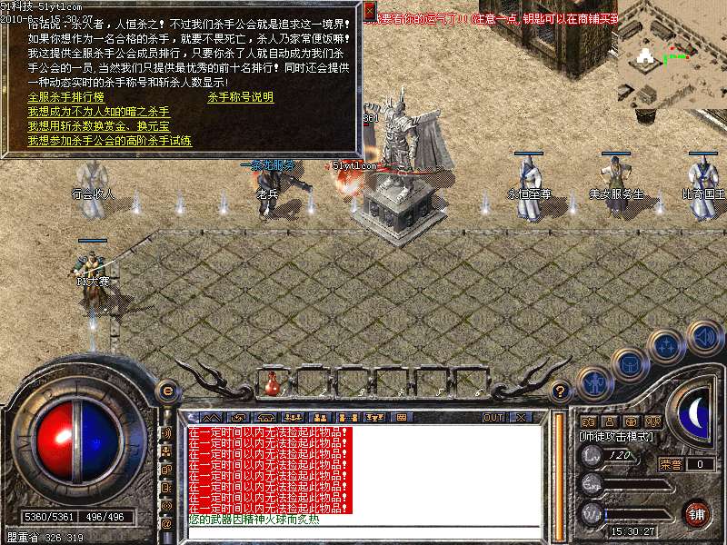 11.杀手工会 当每个玩家将对手击败时(不分地点时间)系统自动提示加入杀手工会!这时候会发名字会多出2行字(入门杀手)和(以斩杀人数) 杀人数量增多称号也改变 。向天下第一称号和沙巴克城主一样神奇!杀人送元宝,杀的越多送的越多!全新任务杀手考试,杀手升级任务地图!杀手之王超靓封号!