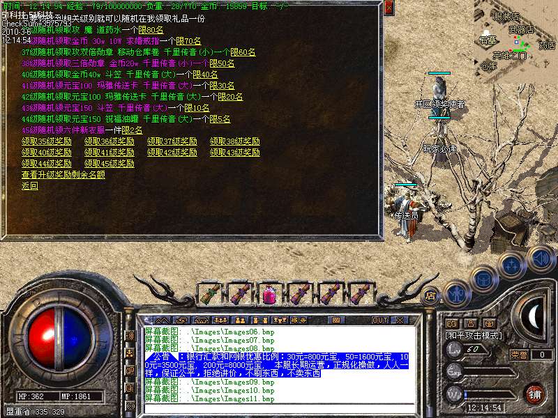现在看到的是永不过时的最经典的老传奇版本.本版本挖矿.封挂.真正的还原传奇1.76版本元宝! 本服所有boss,30分钟刷新一次,大大提高了装备的暴率,更合理的设计,更永久的打算!进入冰宫的方法:可以从石墓直接跑到石墓10层,在石墓10层中间的冰宫看守处进入;也可购买猪八传送卷直接飞到石墓八层再跑下去! 开区后5天千人统一攻城战.沙城主奖励2000元宝! 公告:对本服务器有任何不明白的地方,请打“@帮助”命令,了解服务器的综合问题!本服地图和怪物设置全仿盛大1.76官方设置.关于暴率和地图的坐标有不清楚的玩家请打@帮助 查询. 登陆本服务器需要专用登陆器,否则不能登陆,是为了禁止外挂的出现,登陆器按F12呼出自带内挂,封穿人穿怪。各位PK高手请注意新增的游戏热键: Alt+S 道士下毒模式(互换,绿毒,红毒) | CTRL+V 切换小地图 | CTRL+Z 显示物品名称 | TAB 快速复制人名 | Alt+G 快速组队 | Alt+R 刷新背包 | Alt+Q 快速退出游戏各位PK高手请注意新增的游戏热键: Alt+T 交易 | Alt+S 道士下毒模式(互换,绿毒,红毒) | Alt+I 打开包裹 | Alt+P 组队窗口 | Alt+C 人物窗口 | Alt+V 技能窗口! 玩家和自己的恋人结婚后,除了可以查询伴侣的位置外,还可以使用[@夫妻传唤]指令把恋人传唤到自己身边。请玩家保护好自己的帐号和密码,不要告诉任何人(包括GM)GM无需找任何人索取帐号和密码,如装备被盗,被骗,请立即用密码保护在登录器上找回. 如果你在游戏中发现任何漏洞,请告诉我们,只有你们的支持,我们才会做得更好!走的更远. 本网络服务器为散人服务器,谢绝家族进入收人发群号,如果不听阻告进F的,将被封号处理!武器最高可升级7点.每次升级时间需要30分钟. 本服务器禁止任何外挂,发现使用脱机等外挂者,不管是否花钱,立即永久封号!举报者有元宝奖励!友情提示:人物红名死亡或者回城将进入恶人谷,下方的门可进入万恶之源打宝地图!新区不出售装备,购买元宝请使用元宝自动冲值