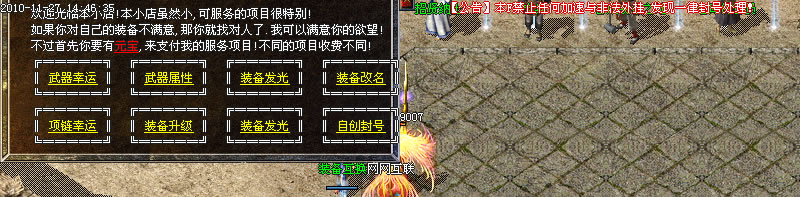《招财进宝》 土城杂货店下招财进宝NPC传送进入 怪物:招财魔王、黄金卫士、招财将军、招财刀客、招财小白、招财宝箱。可以掉落狂雷、王者、青龙、炎龙、雷龙,