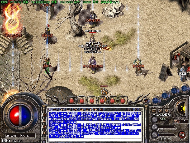 ★★游戏指南:初级新手先到矿区挖矿获得金币且可以很快升到45级,后进入尸王殿获得初级技能.然后进入新手天堂___魔龙血域.这儿的战将类怪物可以轻松获得雷霆和强化雷霆类装备.遇上魔龙教主还有机会获得战神.开天★★