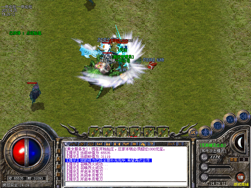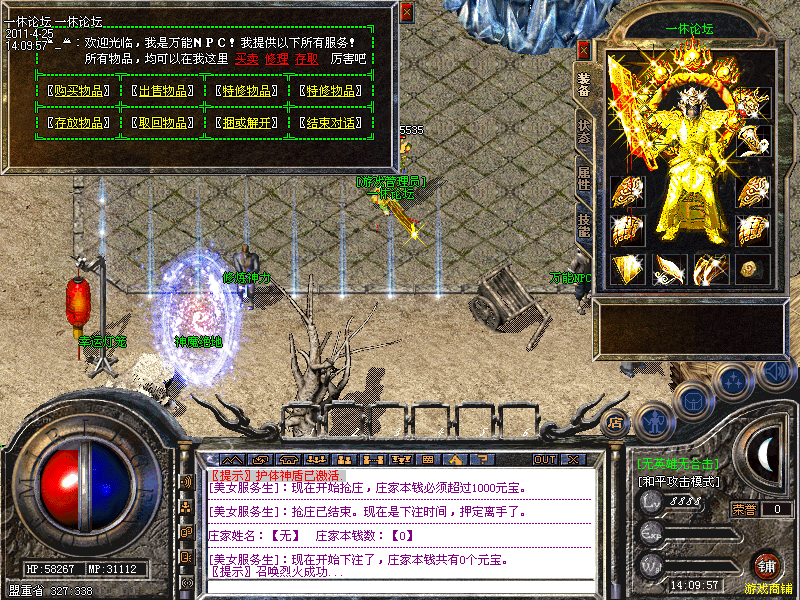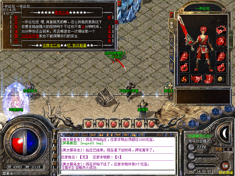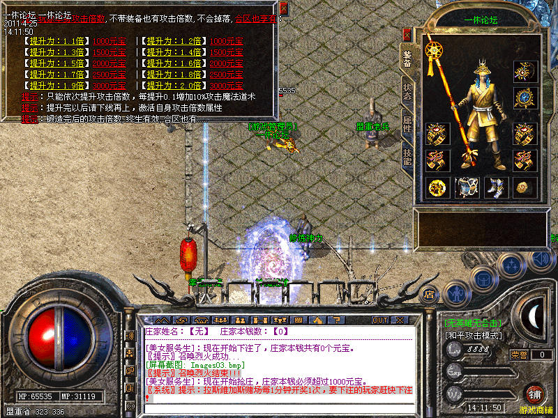 本服务器为:【神秘园】,所有玩家可以自助充值元宝,在土城:343 338 有一个"短信元宝使者",你只要拿起你的手机按照提示发送短信,就可以得到元宝,到屏幕右下方[铺]里购买你想要的东西!