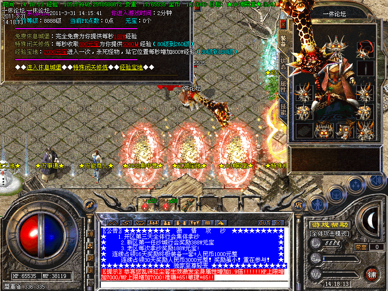 新人出生无需打怪直接点新手传送进入休息间,每进入休息间一次就会获得一个“年兽牌”拥有他可以进休息间免费领取一只年兽!对新手打怪起到了很大的帮助!80级会赠送一套血祭套,助新手打怪寻宝打下基础!升到100级的时候就可以开始你的勇士之旅了!大地图全部都有BOSS在场,等你来挑战。。