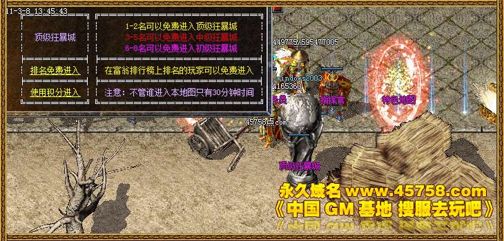 [富翁排行]:本服增加最新富翁排行榜系统.只要你充值元宝在5W元宝以上即可上排行榜.并且拥有进入顶级狂暴城的优先权.排行越靠前进的地图越好.而且免费哦