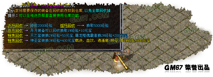 本站沃玛--赤月装备全部可以回收,一键回收系统,请事先将需要保留的装备存放在仓库内,传送员可以直接存取物品.