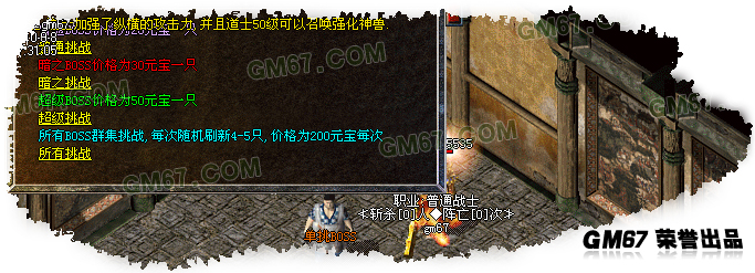 玩家中不乏存在只喜欢挑战BOSS的玩家,因此在土城我们设立了挑战BOSS的商人,八个房间提供高手玩家击杀BOSS使用.