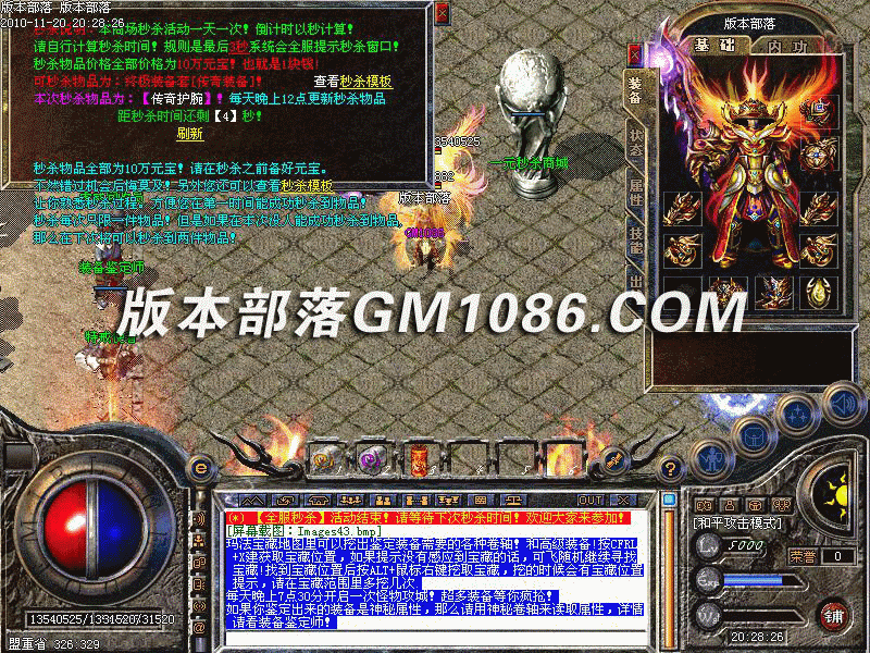 每天每隔4小时财神爷会发放一次宝物!全服高级装备和道具都有!