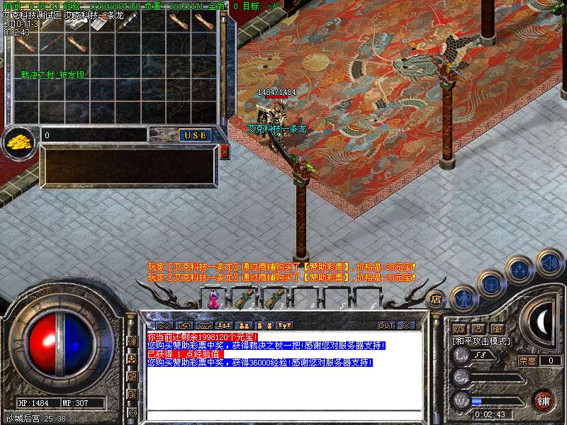 3.首次攻沙奖励5W元宝+2把精品屠龙。本服幸运9为最佳攻击效果!!!