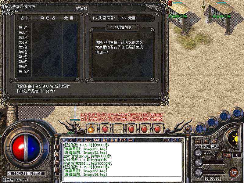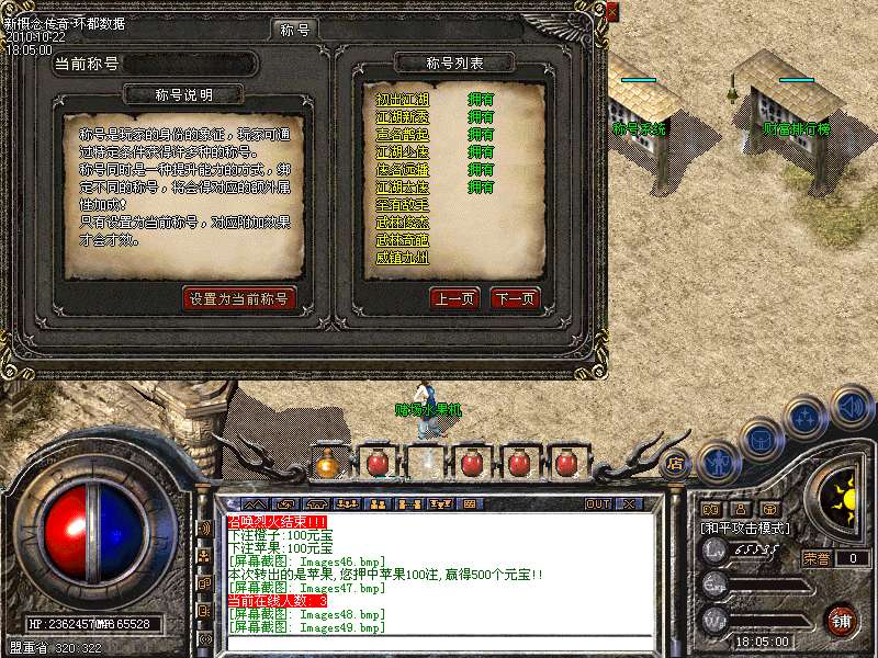 【独家排行系统】不管你有什么实力,只要你有实力。你的名字就能响遍全服。你PK厉害,游戏中有专门的玩家杀戮排名榜;你有钱,游戏中有专门的玩家杀财富排名榜;你装备好,游戏中有专门的装备评价排名榜;你会赌神,一样,别人也会知道你的鼎鼎大名,游戏中也有专门的赌王排名榜。如果你能上各类的排名前十,那么,你将更会获得专门的特殊称号。每个称号也都有玩家想要的属性加成。