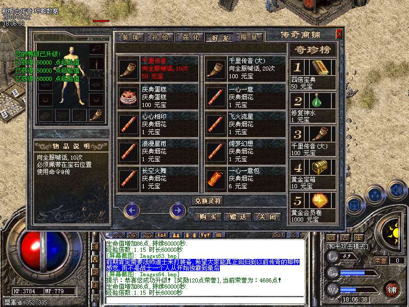 【攻城奖励】新区第一任沙城主获得10000元宝!!攻下城堡之后在皇宫找攻沙奖励NPC领取。第一届沙老大在攻城结束后可以到皇宫里自己领取奖励,只可以领取一次,切记是在10点以后,15分钟内领取奖励。