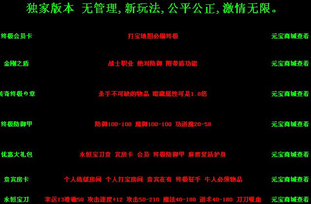 【会员】本服会员拥有强大的功能 赠送等级 套装 在线买药.免费洗红.会员地图.超快练级.在线特修.地图全部免费传送到最深层,新增会员地图 会员BOSS 会员地图必爆终极装备.新增精英殿堂爆率超高